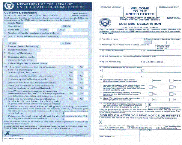 US Customs Declaration Form