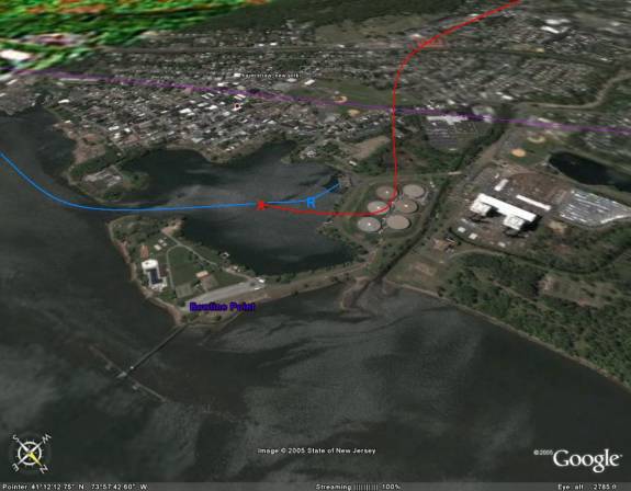 Today, however, I immediately recognized that on the far side of the river, off to the left, lies the town of Haverstraw, NY, where on June 30 I deployed the parachute and crashed into the water. I did not have a camera with me today, but through the magic of Google Earth, here is what I saw: