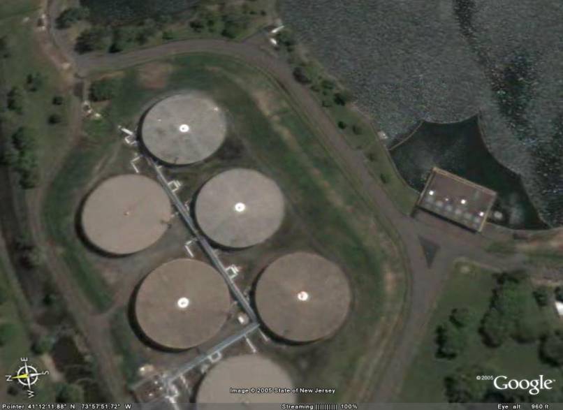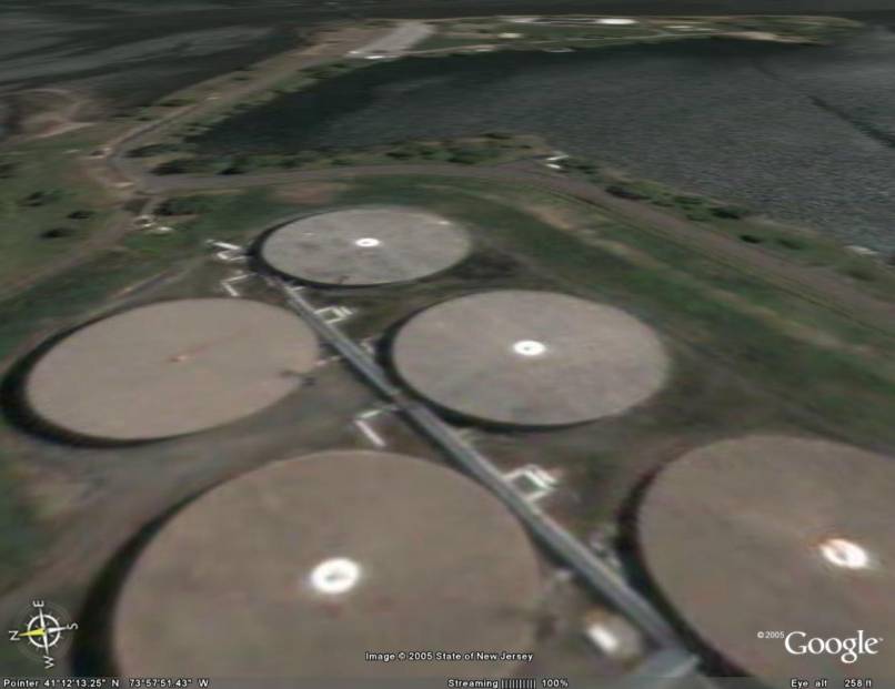View over fuel tank farm just as plane stabilized from the parachute pull